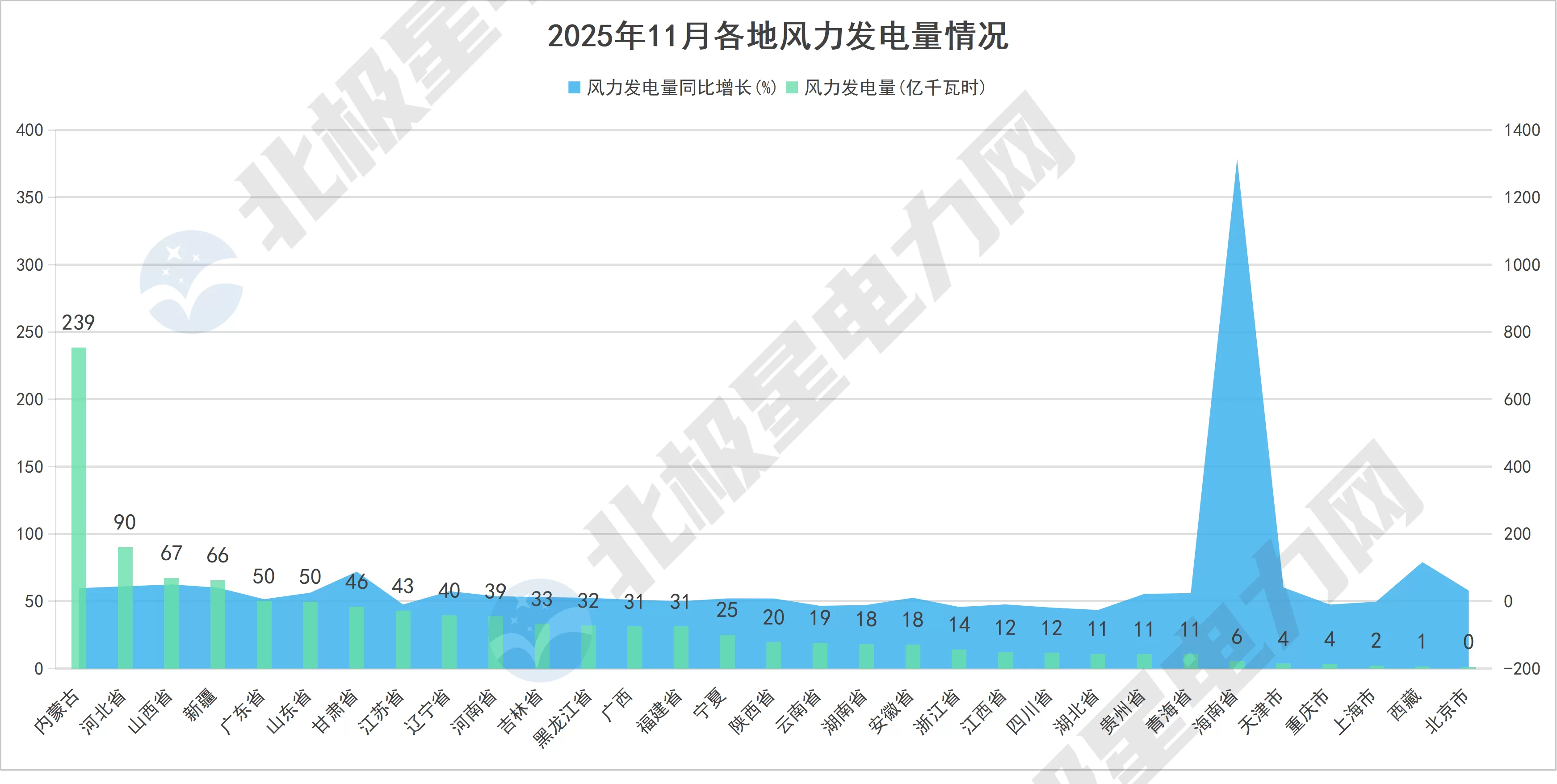 2025年11月,规上风力发电量排在前五的分别是:内蒙古238.6亿千瓦时、河北省90.3亿千瓦时、山西省67.4亿千瓦时、新疆65.7亿千瓦时、广东省50.2亿千瓦时。其中,内蒙古的风力发电量同比增长39%;河北省、山西省、新疆同比增长超40%。