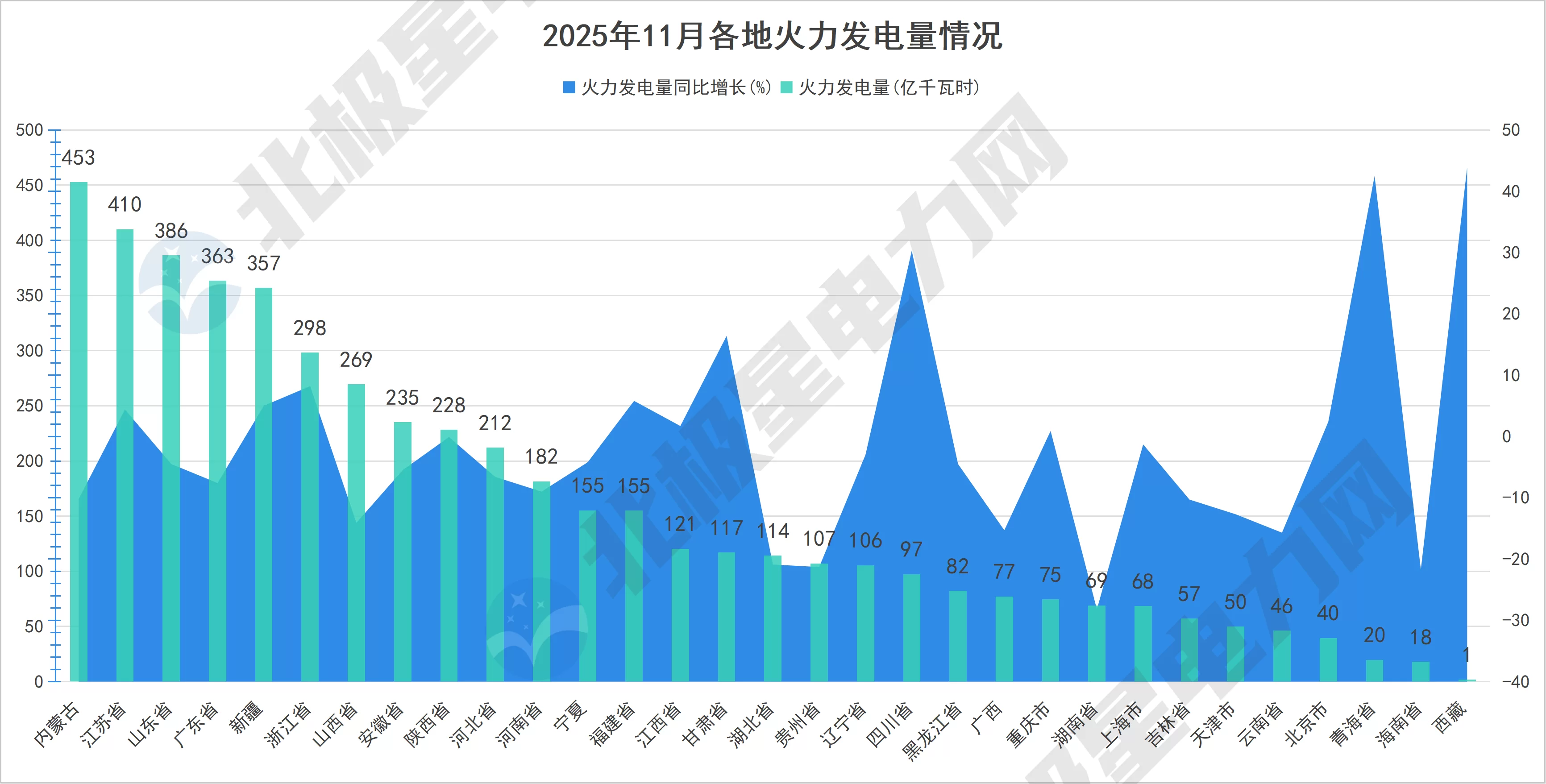 2025年11月,规上火力发电量排在前五的是:内蒙古452.7亿千瓦时、江苏省410亿千瓦时、山东省386.3亿千瓦时、广东省363.2亿千瓦时、新疆357亿千瓦时。