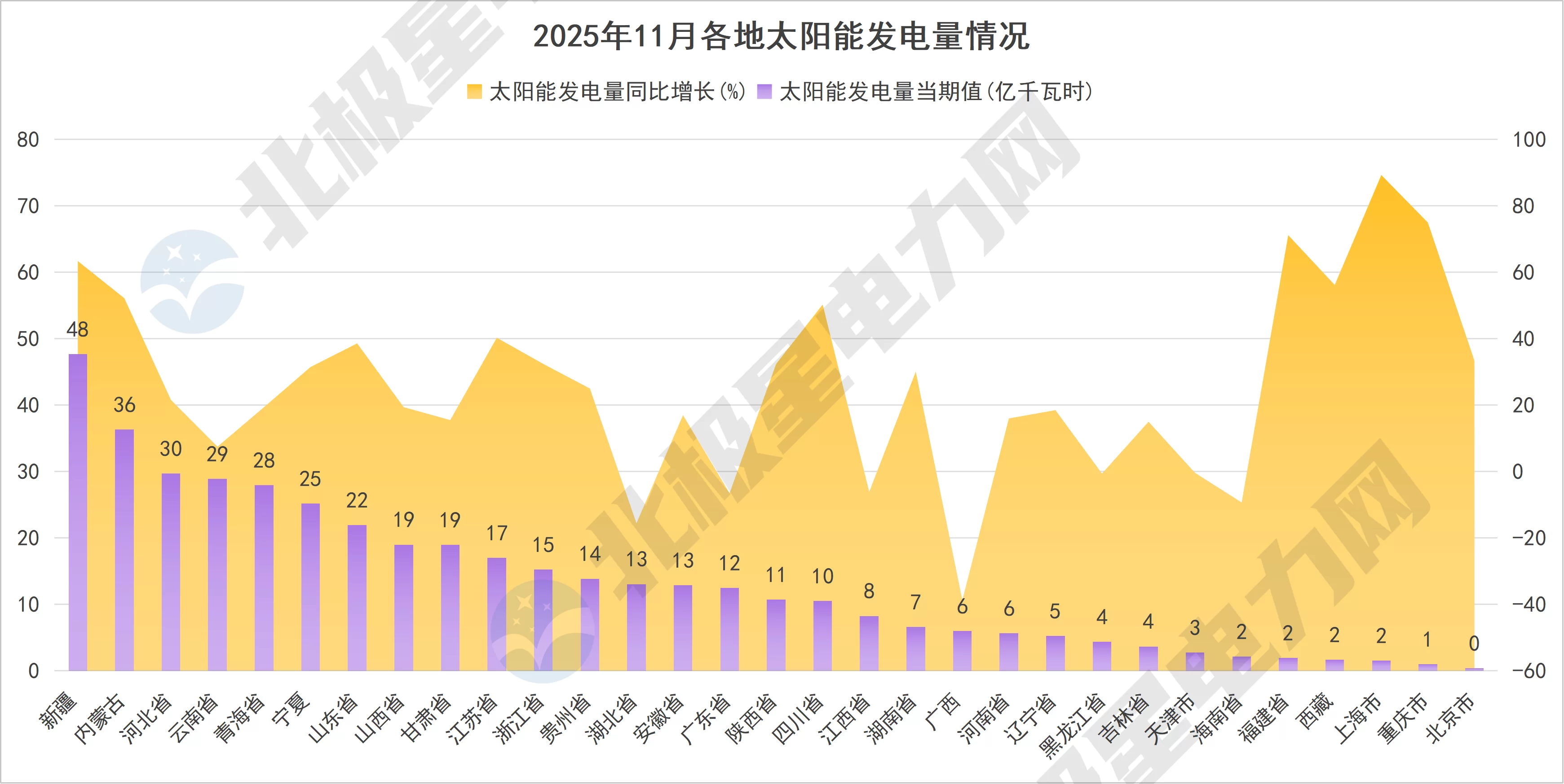 2025年11月,规上太阳能发电量排在前五的分别是:新疆47.6858亿千瓦时、内蒙古36.3066亿千瓦时、河北省29.71亿千瓦时、云南省28.8806亿千瓦时、青海省27.9505亿千瓦时。值得注意的是,新疆、内蒙古的光伏发电量都在快速增长,同比增长都超过了50%。