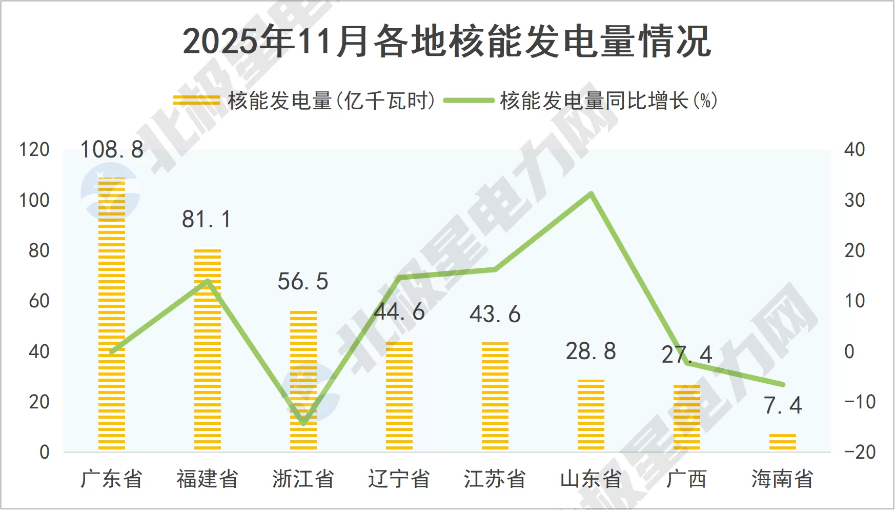 2025年11月,规上核能发电量排在前五的是:广东省108.8亿千瓦时、福建省81.1亿千瓦时、浙江省56.5亿千瓦时、辽宁省44.6亿千瓦时、江苏省43.6亿千瓦时。
