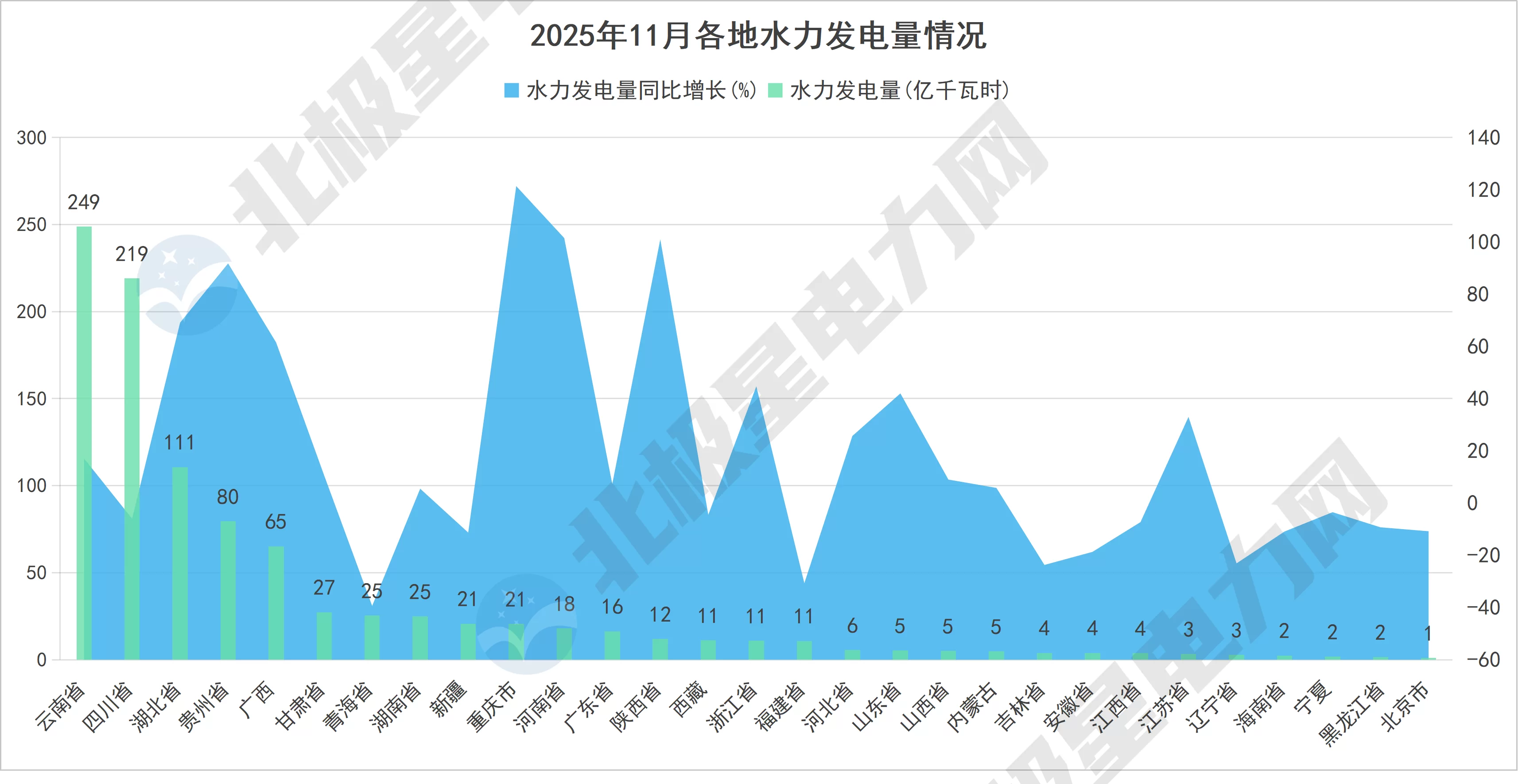 2025年11月,规上水力发电量排在前五的是:云南省248.9亿千瓦时、四川省219.1亿千瓦时、湖北省110.7亿千瓦时、贵州省79.6亿千瓦时、广西65.2亿千瓦时。2025年11月,云南省水力发电量同比增长17.1%,借此“登顶”水力发电量第一名。此外,湖北省、贵州省、广西的水电发电量均有大幅增长。