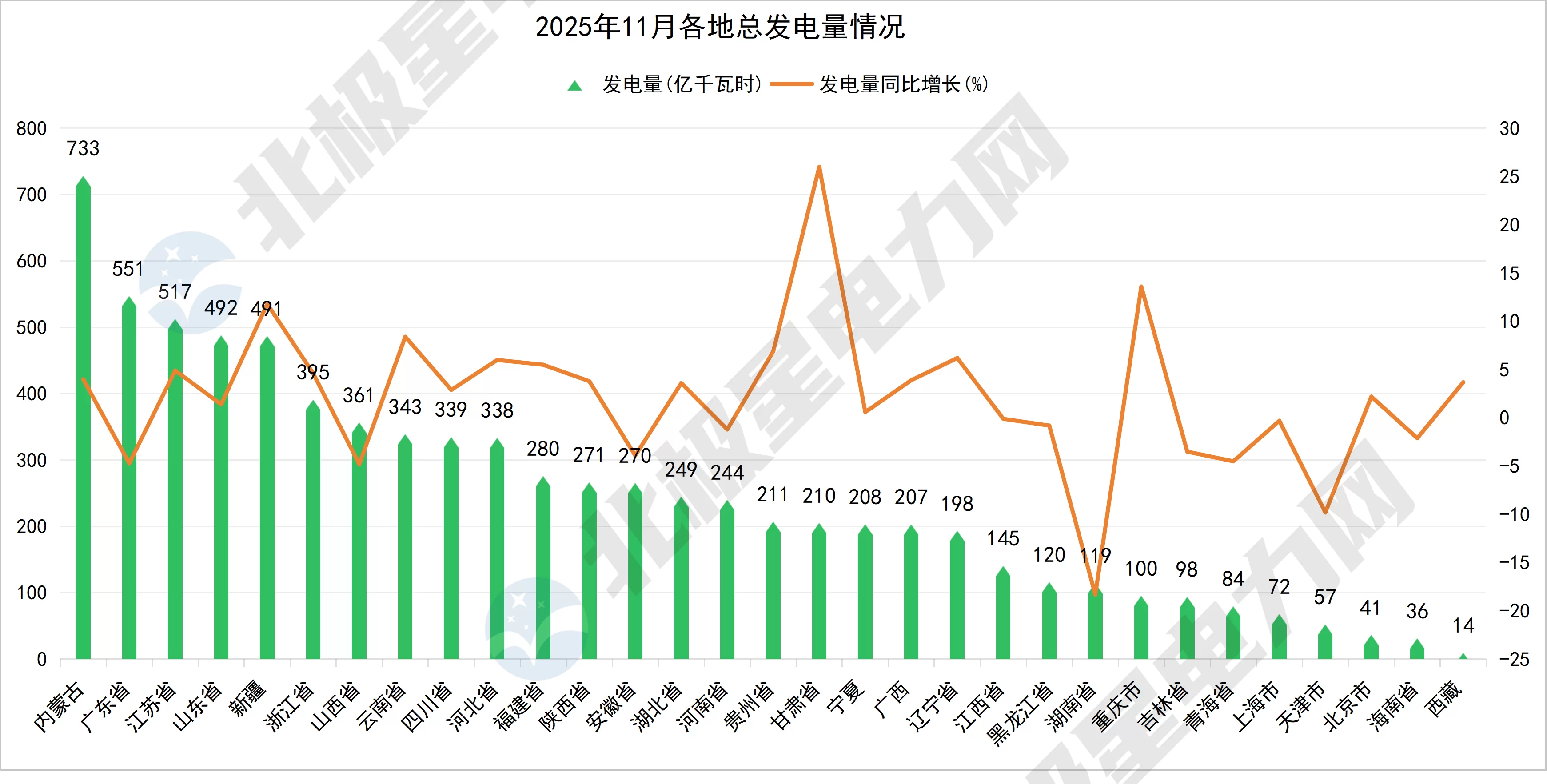 2025年11月,规上总发电量排在前五的是:内蒙古732.5亿千瓦时、广东省551.2亿千瓦时、江苏省516.9亿千瓦时、山东省492.2亿千瓦时、新疆491.1亿千瓦时。