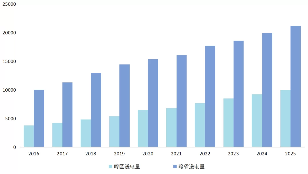 图14 2016—2025年跨区跨省送电量(单位:亿千瓦时)