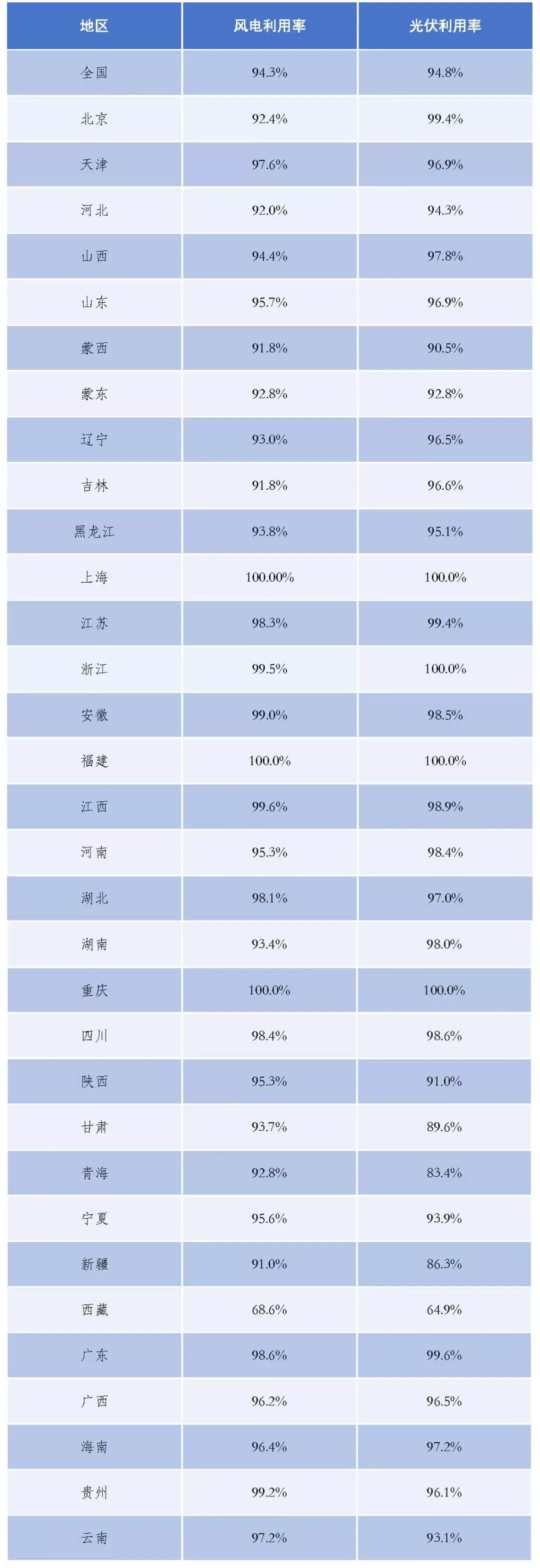全国风电平均利用率94.3%,同比降低1.9个百分点。除上海、福建、江西、湖北、重庆、甘肃、青海、贵州8个地区风电利用率维持在以往水平,其他地区都同比降低。其中,西藏仍是降幅最大的地区。仅有上海、福建、重庆3个地区风电100%消纳。蒙西等13个地区风电利用率低于全国平均水平。