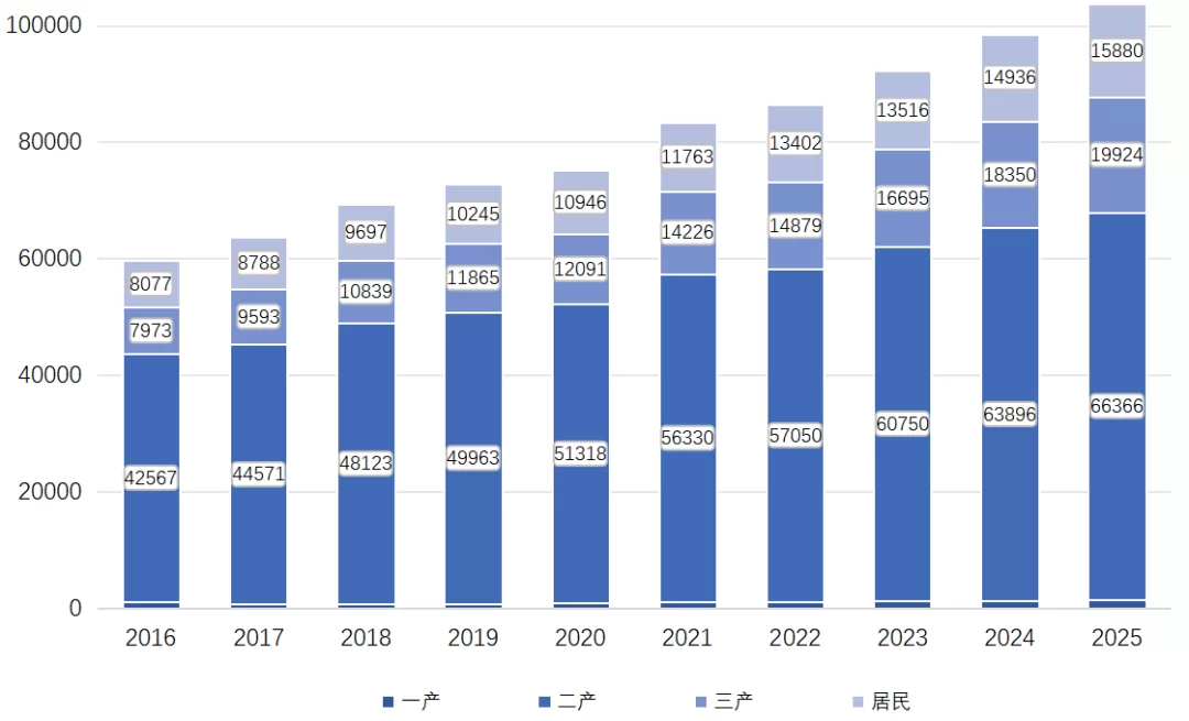 图2 2016—2025年分产业用电量(单位:亿千瓦时)