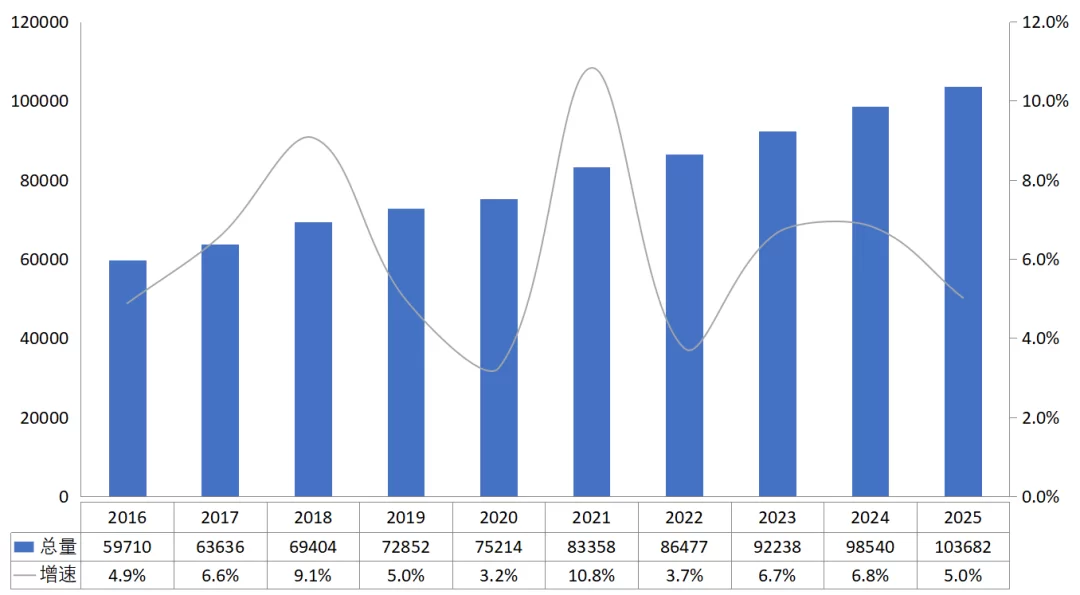 图5 2016—2025年全国发电量和增速情况(单位:亿千瓦时)