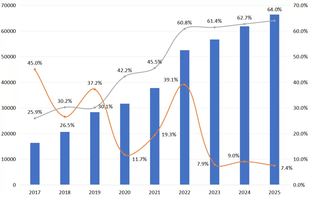 图15 2017—2025年全国市场交易电量及占比情况(单位:亿千瓦时)