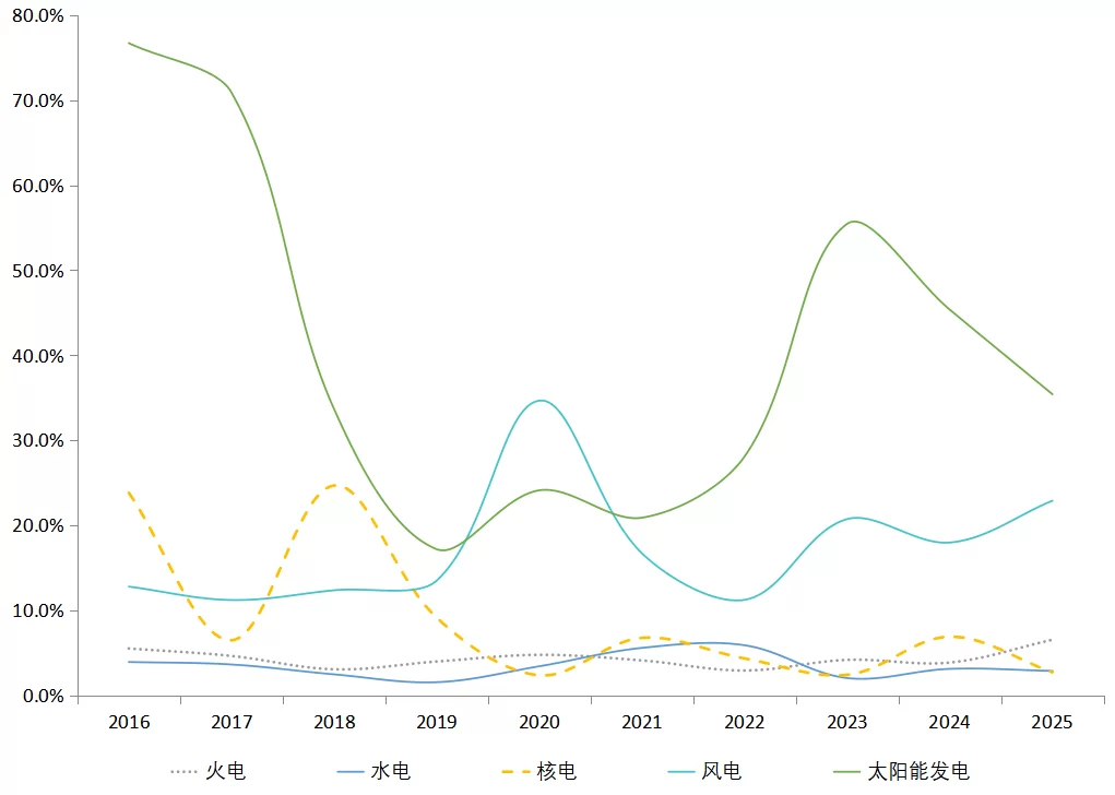 图11 2016—2025年火电、水电、风电、太阳能发电、核电装机增速情况