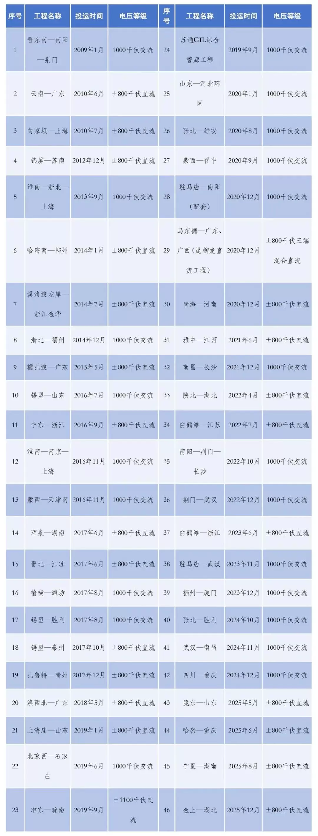 2025年全年共投运4项特高压工程。包括陇东—山东±800千伏、哈密—重庆±800千伏、宁夏—湖南±800千伏、金上—湖北±800千伏特高压直流输电工程。