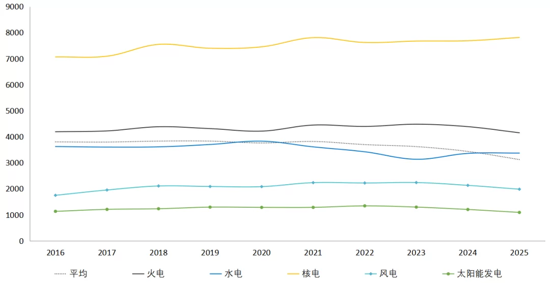 图7 2016—2025年不同电源发电设备利用小时变动情况(单位:小时)