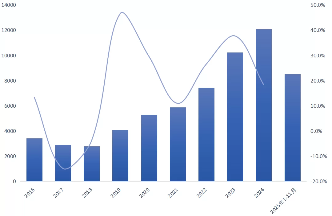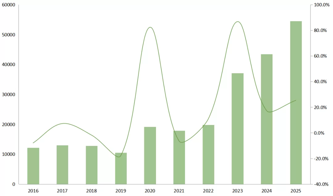 图12 2016—2025年全国新增电力装机及增速情况(单位:万千瓦)