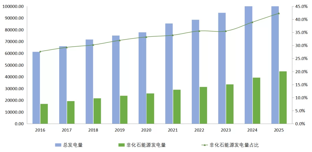 图6 2016—2025年全国非化石能源发电量和增速情况(单位:亿千瓦时)