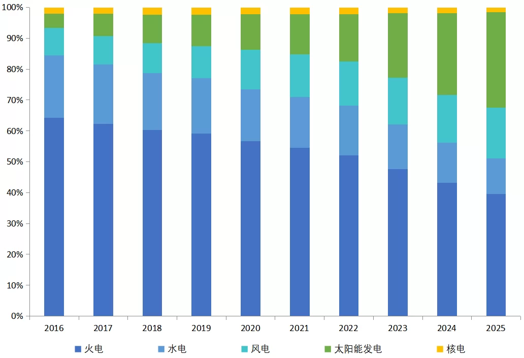 图10 2016—2025年全国电力装机结构