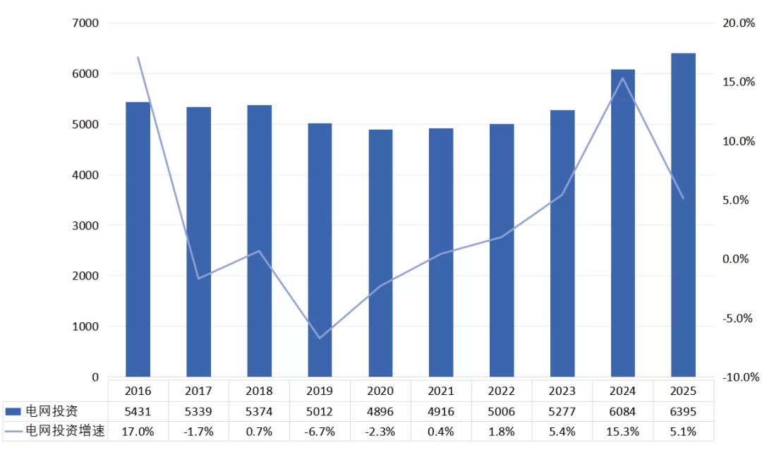 图13 2016—2025年全国电网投资及增速(单位:亿元)
