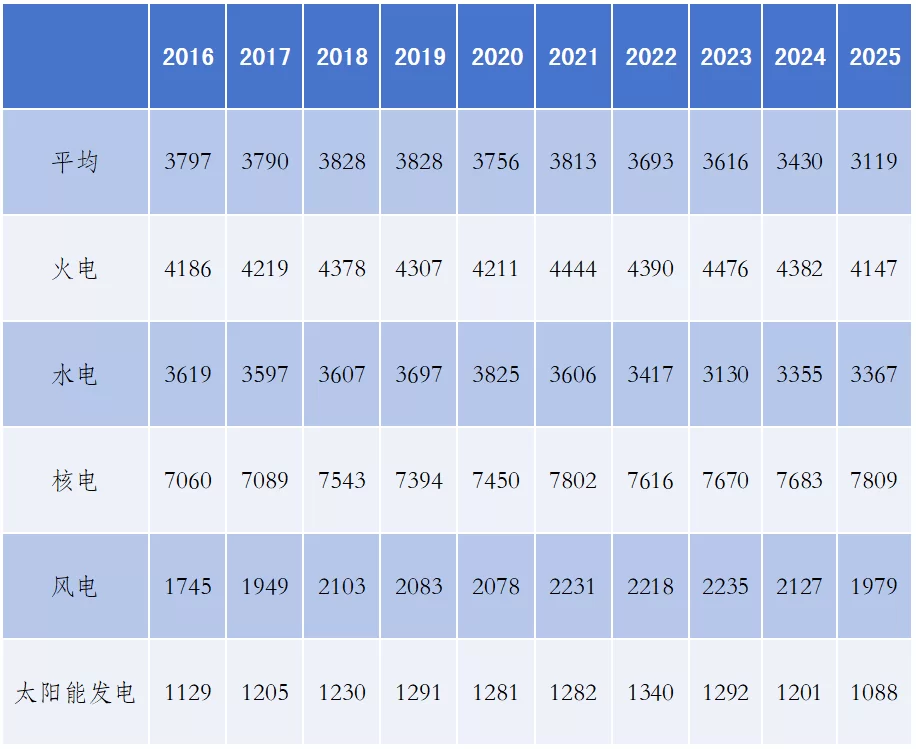 表1 2016—2025年发电设备利用小时数(单位:小时)