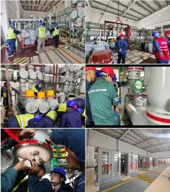 工程改造分两阶段实施,第一阶段停电作业时间为10月26日至31日,核心任务为220千伏待用Ⅰ线214、待用Ⅱ线216(自西向东第一出线间隔)、#2主变202(待用)三个间隔的对接施工。在实施过程中,项目部和作业层班组克服空间狭小,设备尺寸过大不能拆解的难题,通过精密计算,与运维单位、厂家多次沟通,最终采用分段式吊装与多点协同牵引方案。面对吊点少、设备重、常规吊装无法实现的困难,团队创新采用多台手扳葫芦和滑轮组组合运用的形式,在狭窄空间内实现设备精确定位与微动调整,体现了“计算先行、技术破局”的施工理念。安装过程中严格遵循GIS设备安装规范,精准完成设备就位、间隔对接、厂家电缆敷设、抽真空注气等关键工序,同步开展断路器回路电阻测试、微水测试及检漏等质量管控环节,对保护调试、耐压试验和联调联试等关键节点进行精密部署,确保各项作业紧张有序、衔接顺畅,最终如期实现Ⅰ母线恢复送电。