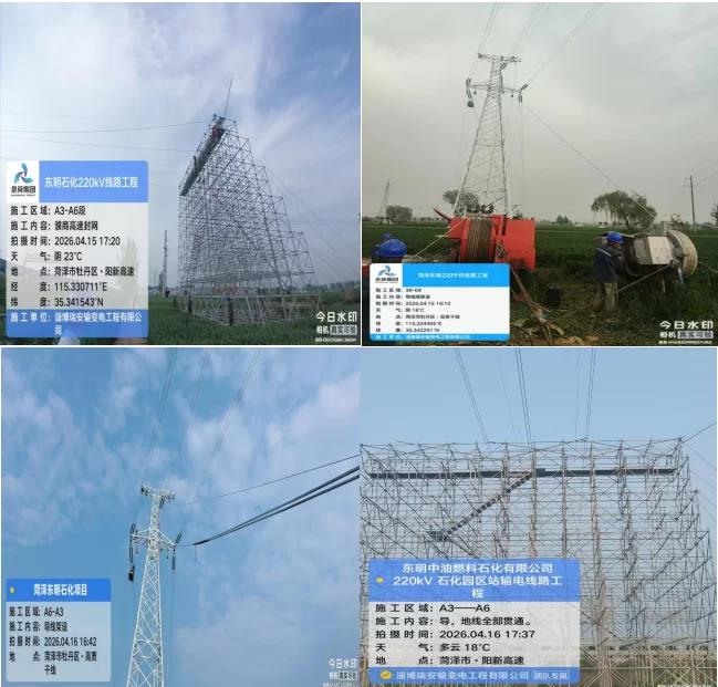 2026年4月,瑞安公司承建的东明中油燃料石化有限公司220千伏石化园区站输电线路工程跨越架线施工迎来集中攻坚期,项目团队连续作战、高效转场,精准攻克多条线路停电、濮新高速跨越等多重施工任务,在密集工期与复杂工况下圆满完成关键节点,顺利实现全线贯通,为工程后续竣工验收、按期投运筑牢坚实基础。